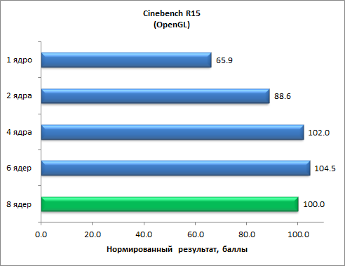 В подтесте OpenGL теста Cinebench R15 ситуация следующая. При увеличении числа ядер процессора до четырех скорость рендеринга видеофрагмента увеличивается. Однако дальнейшее увеличение числа ядер процессора не способствует увеличению скорости рендеринга, и для конфигурации с восемью ядрами наблюдается даже падение скорости.