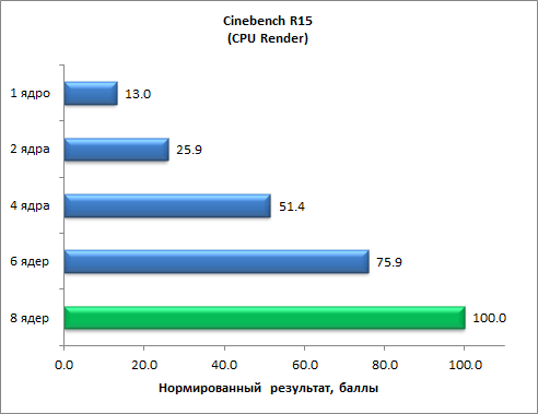 В тесте Cinebench R15 скорость процессорного рендеринга (CPU Render) практически линейно зависит от числа ядер процессора, причем удвоение числа ядер приводит к удвоению скорости рендеринга. Собственно, это понятно и логично.