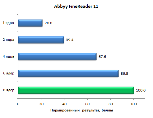 В тесте на основе приложения Abby FineReader 11 мы получили почти линейную зависимость скорости распознавания текста от числа ядер процессора.