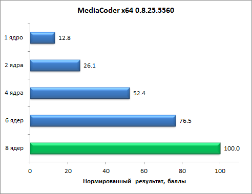 Итак, начнем с приложения MediaCoder x64 для транскодирования видео. Как видно по результатам тестирования, это приложение отлично оптимизировано под многоядерность, и чем больше у процессора ядер, тем выше скорость транскодирования видео.