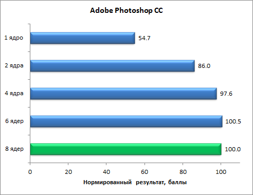 Приложение Adobe Photoshop CC также не очень хорошо оптимизировано под восемь ядер процессора. И если увеличение числа ядер процессора до четырех еще приводит к росту производительности, то для четырех, шести и восьми ядер результат практически один и тот же.