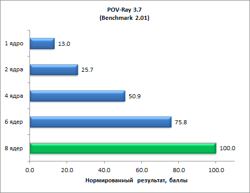 В бенчмарке для приложения POV-Ray 3.7 все оказалось достаточно логично. Здесь чем больше ядре процессора, тем лучше результат. Причем удвоение числа ядер приводит к удвоению скорости рендеринга.