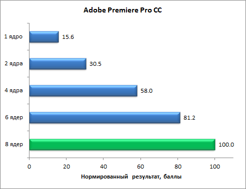 Отличную оптимизацию под многоядерные процессоры демонстрирует и приложение Adobe Premiere Pro CC. Удвоение числа ядер процессора приводит к адекватному удвоению производительности.
