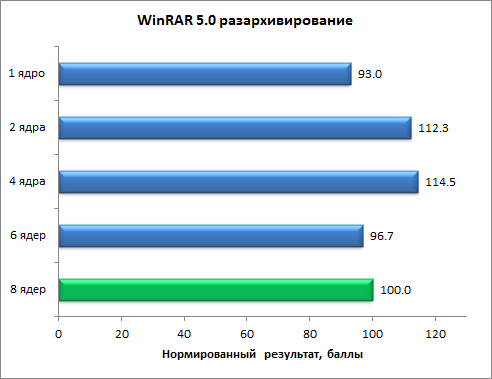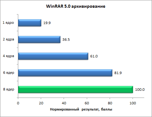 Скорость архивирования данных с использованием утилиты WinRAR 5.0 также линейно зависит от числа ядер процессора. И восемь ядер для процесса архивирования будут весьма кстати.
