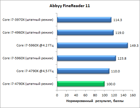 В тесте по распознаванию текста c использованием приложения Abbyy FineReader 11 восьмиядерный процессор Core i7-5960X продемонстрировал неплохой результат, опередив на 23% (в штатном режиме) четырехъядерный Core i7-4790K. Причем в этом тесте Core i7-5960X незначительно опережает и шестиядерные процессоры Core i7-4960Х и Core i7-3970X.