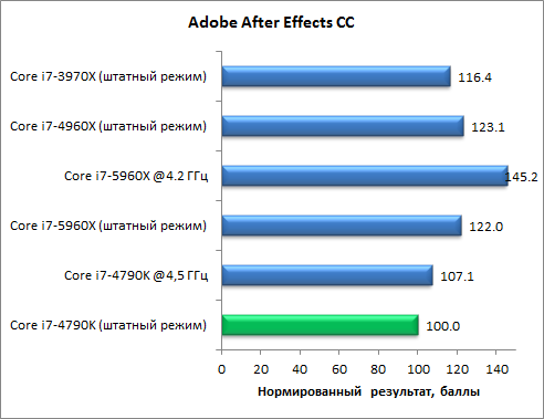 В тесте c использованием приложения Adobe Audition восьмиядерный процессор Core i7-5960X потерпел фиаско. В штатном режиме работы он продемонстрировал производительность на 25% ниже, чем Core i7-4790K, и даже разгон до частоты 4,2 ГГц не смог поднять уровень его производительности в этом тесте до уровня процессора Core i7-4790K.