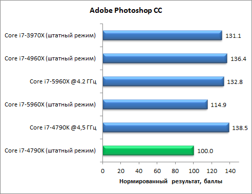 В тесте пакетной обработки фотографий c использованием приложения Adobe Photoshop CC процессор Core i7-5960X в штатном режиме работы хотя и имеет небольшое преимущество (15%) над Core i7-4790K, тем не менее, уступает и процессору Core i7-3970X, и процессору Core i7-4960X. И только разгон Core i7-5960X до тактовой частоты 4,2 ГГц позволяет получить уровень производительности, который демонстрируют Core i7-3970X и Core i7-4960X в штатном режиме работы.