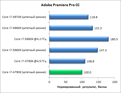 В тесте с использованием приложения Adobe Premiere Pro CC восьмиядерный процессор Core i7-5960X также является явным лидером и в штатном режиме работы обгоняет четырехъядерный процессор Core i7-4790K на 47%. Как видим, приложение Adobe Premiere Pro CC тоже неплохо оптимизировано под многоядерные процессоры.