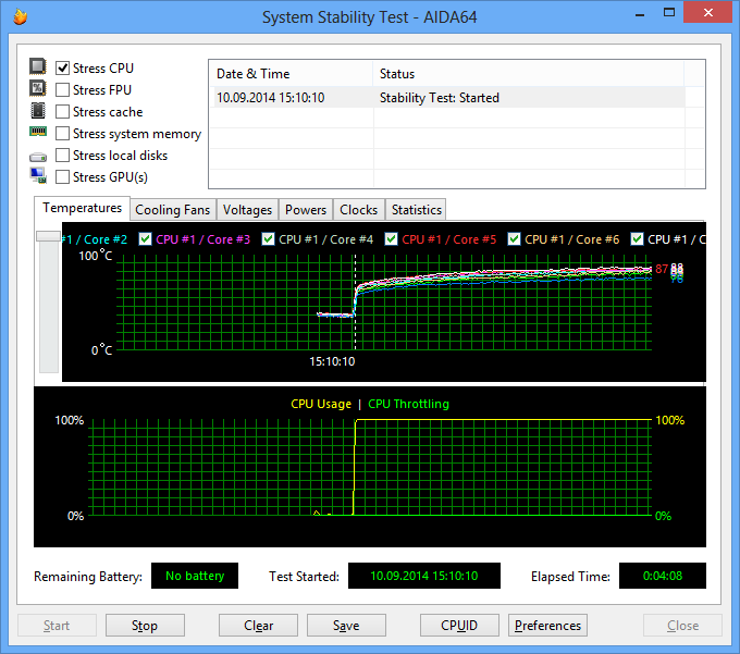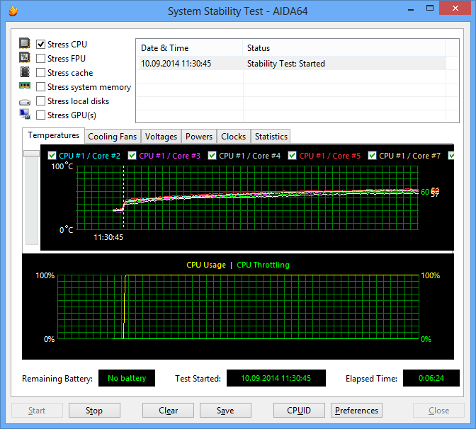 Итак, рассмотрим результаты тестирования процессора Core i7-5960X в разных режимах загрузки. Для стрессовой загрузки процессора мы использовали утилиту AIDA64.