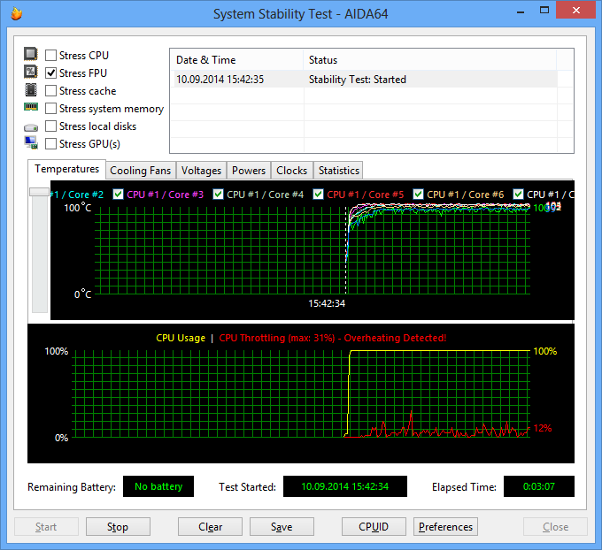 При загрузке тестом Stress FPU, который значительно сильнее нагревает процессор, частота ядер Core i7-5960X составляет 3,2 ГГц, а их температура поднимается до 90 °C. Потребляемая мощность процессора при этом составляет уже 125 Вт. В данном режиме загрузки процессора при охлаждении штатным кулером может наблюдаться троттлинг. Напряжение питания ядер процессора в данном режиме составляет 1,027 В.