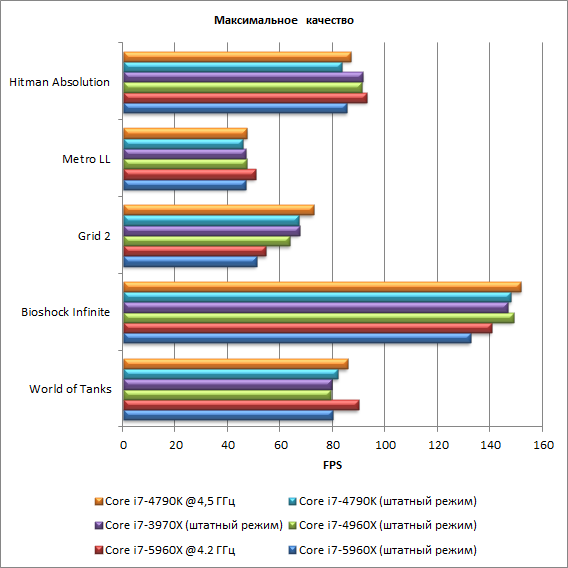 То, что даже при настройках на максимальное качество все игры продемонстрируют комфортный уровень производительности (выше 40 FPS), было очевидно изначально — все-таки речь идет о самых мощных процессорах и самой мощной видеокарте. Показательным в данном случае является тот факт, что в играх восьмиядерный процессор Core i7-5960X не имеет никакого превосходства над шестиядерными процессорами и даже над четырехъядерным Соrе i7-4790K. Более того, без разгона Core i7-5960X обеспечивает даже более низкий уровень производительности в играх (при настройках на максимальное качество) в сравнении с конкурентами. (Исключение составляет лишь игра Metro LL, где при настройках на максимальное качество результаты для всех процессоров практически одинаковы.)