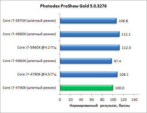 Ну а в тесте c использованием приложения Photodex ProShow Gold (создание фильма из фотографий) процессор Core i7-5960X в штатном режиме работы уступает всем остальным. Похоже, что в этом тесте не задействуются все ядра процессора, и результат в большей степени зависит от частоты, нежели от количества ядер.