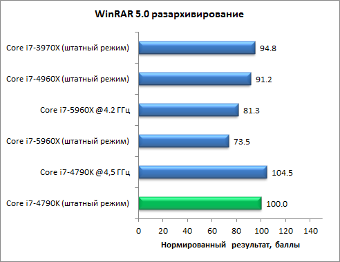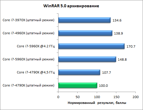 А вот в тесте c использованием приложения WinRAR 5.0 ситуация довольно интересная. При создании архива восьмиядерный процессор Core i7-5960X (в штатном режиме работы) почти на 50% обгоняет четырехъядерный Core i7-4790K и имеет небольшое преимущество над шестиядерными Core i7-3970X и Core i7-4960X. Здесь активно задействованы многопоточные вычисления. Однако при разархивировании данных Core i7-5960X, наоборот, проигрывает четырехъядерному Core i7-4790K почти 26% и уступает процессорам Core i7-3970X и Core i7-4960X.