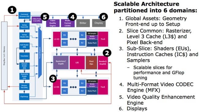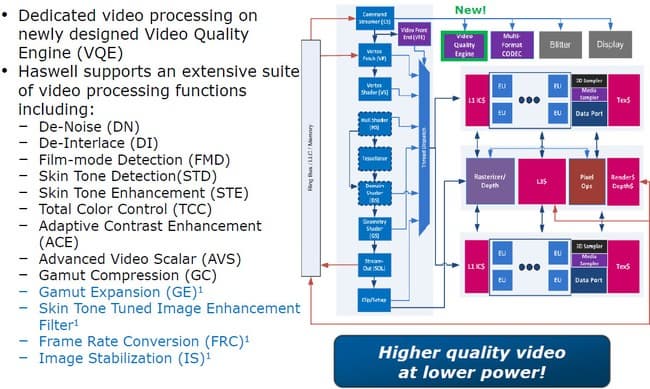 С переходом на IB графические ускорители, помимо увеличения количества графических ядер, получили второй текстурный семплер, кэш L3, увеличенные объемы текстурных кэшей L1 и L2. В Haswell архитектурные изменения в основном заключались в увеличении количества графических процессоров, добавлении новых исполнительных блоков, таких как Video Quality Engine (VQE) и Resource Streamer, а также усовершенствовании старых блоков — Texture Sampler, Multi Format Codec. Стоит заметить, что и компоновка исполнительных модулей (EU) изменилась — ранее 16 EU вытягивались в длинную цепочку, теперь же EU располагают сверху и снизу блоков растеризации и кэша L3, по 10 EU. Стоит заметить, что в модификации ядра GT3 не только происходит удвоение EU с 20 до 40, но и дублируется весь блок Slice Common, который содержит в себе блоки растеризации, кэш L3, блоки пиксельных операций. То есть происходит не просто наращивание количества конвейеров, но и удвоение других немаловажных блоков, таких как блоки растеризации, пиксельной обработки и рендера.