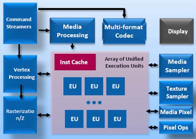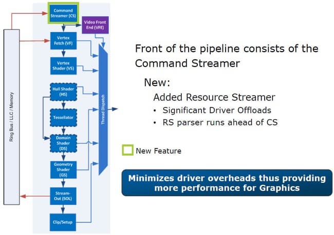 В состав блока Command Streamer теперь входит блок Resource Streamer, который разгружает центральный процессор, беря некоторые функции драйвера на себя. Это позволяет снизить нагрузку на центральный процессор и повысить производительность.