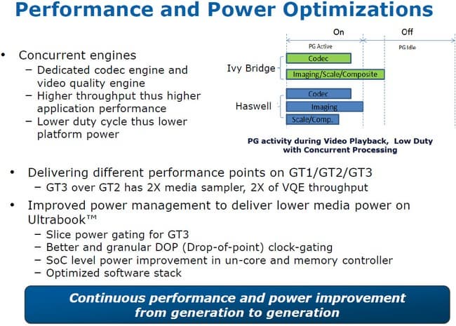 Как видим, часть улучшений была направлена на снижение потребления электроэнергии. Графические ядра Haswell позволяют экономить электроэнергию в мультимедийной нагрузке — как видно из слайда, за счет большего распараллеливания ядро Haswell раньше заканчивает работу и раньше погружается в экономичное состояние простоя.