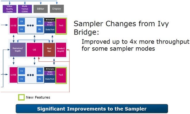 Переработанный текстурный семплер. По утверждению компании Intel, в некоторых режимах прирост текстурной производительности может достигать четырех раз.