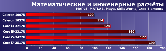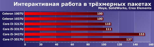 Хорошо заметен проигрыш одноканального режима памяти — как Celeron 1037U, так и Core i5-3317U фактически не сумели обогнать процессоры с меньшей частотой, но двухканальной памятью. А i5-3427U продемонстрировал, что «подвиг» прошлой зимы (когда резко увеличилась производительность в 3D-приложениях профессионального назначения) был далеко не последним — и после него остался еще немалый резерв для оптимизаций, что позволило повысить производительность еще на 10%. Можно, конечно, побрюзжать на тему того, что «нормальные» драйверы следует писать сразу, а не полтора года их допиливать, однако о(б)суждение этой проблемы уже набило оскомину. Причем применительно не только к Intel, но и к AMD или NVIDIA. Факт остается фактом — производительность (а часто и функциональность) GPU зависит не только от аппаратных характеристик последнего, но и от программной составляющей. Которая становится с каждым годом все более и более сложной. И реализация всего потенциала «железа» тоже. Доработку драйверов для IGP Sandy Bridge в Intel прекратили только весной этого года — спустя почти два с половиной года после выхода самих процессоров. Стало быть, и из Ivy Bridge наверняка что-то можно будет «наковырять».