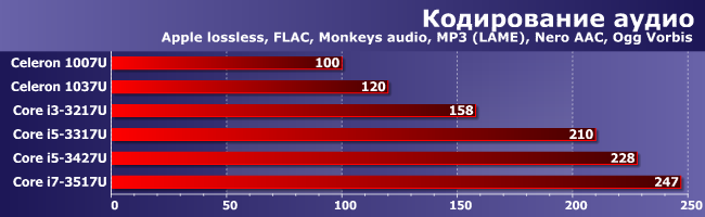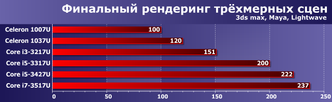 Первая принципиальная граница — наличие/отсутствие поддержки Hyper-Threading, которая способна при прочих равных обеспечить в этих задачах процентов 20 производительности. Вторая — Turbo Boost: запас по тактовой частоте для Ivy Bridge (даже ультрамобильных моделей) достаточно велик для того, чтобы четко разделить Core i3 и Core i5. А вот младшие Core i7 работают на уровне старших Core i5, что тоже логично — все радикальные «улучшайзеры» задействованы уже в последних. Т.е. мы потихоньку (и не в первый раз) приходим к выводу, что в сегменте мобильных процессоров двухъядерные Core i7 в общем-то... Тоже не нужны. Четыре ядра MQ/HQ да — качественно иной уровень. А вот при наличии двух — хватит и Core i5. Начиная с него и ниже позиционирование процессоров Intel становится простым и логичным. За исключением, разве что, Pentium — внятной ниши для них уже не видно. Впрочем, в последнее время они и аппаратно не слишком отличаются (или вообще не отличаются) от Celeron, да и стоят зачастую столько же, так что это просто красивый шильдик для нелюбителей Celeron. В мобильном, напомним, сегменте — среди настольных процессоров все немножко по-другому.