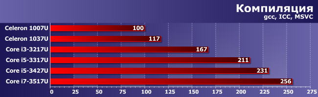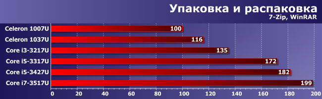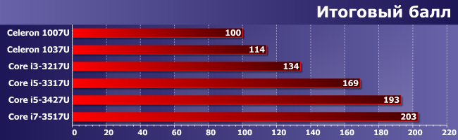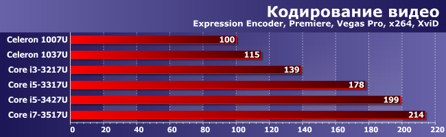 Что ж — несмотря на своего рода эпопею с драйверами, на конечном результате она сказалась не слишком сильно: большинство тестов от видеочасти не зависит, так что работают, как работали. В целом же распределение низкопотребляющих процессоров Intel по разным семействам подтверждено практическими измерениями. С учетом вышесказанного — во-первых, нет определенной ниши для Pentium, а во-вторых, несколько надуманным выглядит существование Core i7. Но и то, и другое имеет простые и логичные объяснения: нынешние ультрамобильные Pentium отличаются от Celeron только тактовой частотой (а то и вовсе не отличаются — единственная модель данного сегмента, а именно Pentium 2117U в точности идентична Celeron 1037U; только появилась на пару кварталов раньше), а Core i7 и Core i5 различает лишь емкость кэш-памяти третьего уровня и, опять же, частоты. Но незначительно. В то время как в более низких сегментах различия кардинальные — обе ключевые технологии Core (Hyper-Threading и Turbo Boost) поддерживает только Core i5. Спускаемся чуть ниже (на уровень Core i3) — лишаемся Turbo Boost. Еще ниже — остаемся и без Hyper-Threading, и довольствуемся упрощенным GPU.
