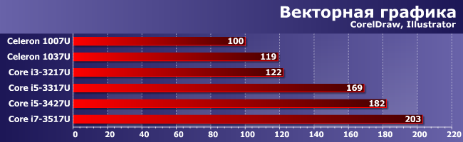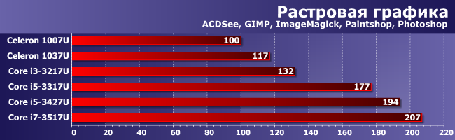 Что любопытно — и здесь она же, хотя часть подтестов уже может загрузить работой более двух потоков вычисления, в конечном итоге эффект оказывается смазанным из-за принципиально-однопоточного GIMP или двухпоточного PaintShop. В общем, приходим к выводу, что ключевой для ультрамобильных решений технологией является Turbo Boost — польза от него есть везде и видна невооруженным глазом. А вот все остальное — когда работает, а когда и никакого эффекта.
