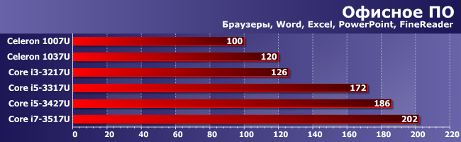 Выбирая для «обычной офисной» работы между Celeron и Core i3, очевидно, стоит остановится именно на первом, ибо дешевле :) А можно и доплатить за Core i5 — будет дороже, но комфортнее. Конкуренция только внутривидовая — тот же i5-3317U в три раза быстрее Brazos, а превосходство над старыми Atom может достигать и четырех раз (сравнительно с нетбучными моделями первого поколения — и пяти-шести), т.е. это в принципе разные классы оборудования. Однако таковые они не только с точки зрения скорости, но и по цене конечных продуктов. В то же время, работать можно на всем — пусть и без удовольствия :) В общем, как это обычно и бывает в жизни, за что вы платите — то и получите.