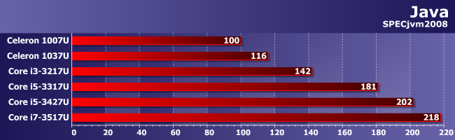 SPECjvm умеет задеействовать более четырех потоков вычисления, так что картина более гладкая, чем, например, в предыдущем случае — Core i3 уже посередке между Celeron и Core i5, а не ближе к первым. Такое мы видим уже не в первый раз — просто очередное подтверждение выдвинутых выше предположений.