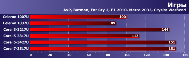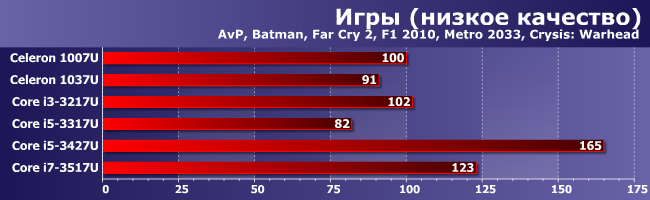 Главное, что мы собирались проверить — с чем связано то, что Celeron 1007U вышел на уровень Core i3-3217U в таком режиме: только лишь с обновлением драйверов или с аппаратными особенностями? Проверили и убедились, что все дело в драйвере. Что ж — хоть так, хоть эдак, а есть повод для радости: пусть и не сразу, но программистам Intel удалось несколько «развязать» работу CPU и GPU так, чтобы в «легких» режимах они перестали «тормозить» друг друга. Жаль только, что произошло это уже позже выхода в свет нового поколения интегрированной графики, однако и на нем должно сказаться — как мы видели, еще летом производительность Core i7-4500U с такой нагрузкой не слишком отличалась от весенних результатов i7-3517U, так что вряд ли она осталась на том же уровне сейчас. Что, впрочем, мы в ближайшее время постараемся проверить, ну а пока просто констатируем факт, что, начиная с версии 9.18.10.3257 (или около того) были исправлены многие ошибки, так что теперь соотношение производительности решений разного уровня с «легкими» настройками похоже на таковое в «тяжелом» режиме: HDG 4000 примерно в полтора раза быстрее 2500 или «безлитерного».