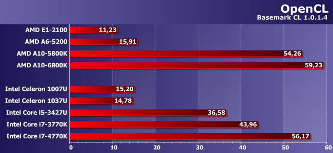 Как уже было сказано, этот тест мы начали использовать совсем недавно, причем в качестве эксперимента, так что «под рукой» имеются результаты лишь небольшого количества процессоров. Но сегодня нам удалось измерить и производительность ультрамобильного процессора с HDG 4000 (чего ранее так и не хватало), так что на диаграмме будут почти все — включая старшие настольные модели AMD и Intel, но без Celeron 847, который исполнял OCL-код только на процессорных ядрах со всеми вытекающими.