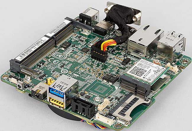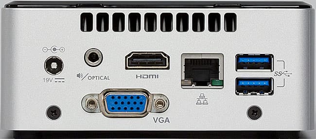 А вот задняя панель от «взрослых» NUC отличается радикально — хотя бы наличием аналогового VGA-разъема и оптического аудиовыхода (его также можно использовать и как стереоразъем для колонок — в данном качестве более удобный, чем фронтальный), который особенно порадует тех, кто еще не обзавелся новомодным ресивером с подключением через HDMI. Вообще же применение в рамках домашнего кинотеатра, судя по всему, рассматривалось дизайнерами очень серьезно: в частности и второй видеовыход в этих моделях — полноразмерный (а не миниатюрный) HDMI. Здесь же присутствует еще пара портов USB 3.0 (в отличие от DN2820FYKH, где задние порты поддерживали лишь вторую версию спецификации), разъем гигабитной сети (в бюджетном семействе используется бюджетный же чип Realtek 8111HN с интерфейсом PCIe) и вход блока питания.