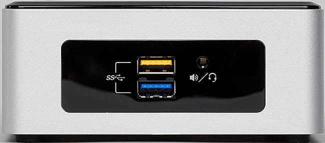 По габаритам младшие NUC напоминают «толстые» модификации старших второго и третьего поколения, но даже немного толще последних: размеры корпуса составляют 115×111×52 мм. Однако каких-то 2,6 мм увеличения толщины невооруженным глазом заметить сложно, так что в глаза бросается только то, что USB-порты на передней панели теперь расположены не рядом (как в NUC на Core), а один над другим. Но во всех компьютерах текущего поколения оба поддерживают стандарт USB 3.0, причем один из передних портов (выкрашенный в оранжевый цвет) может похвастаться повышенной до 1,5 А (вместо 0,9 А по стандарту) силой тока и пригодностью для зарядки мобильных устройств, типа смартфонов или планшетов, даже в спящем режиме компьютера. Ранее этого не было, да и вообще — на передней панели DN2820FYKH располагался лишь один порт USB 3.0. Тут же (кроме уже упомянутых USB-портов) находятся также разъем для аудиогарнитуры и инфракрасный приемник, а при желании можно доукомплектовать компьютер и NFC-ридером: все «как у взрослых».