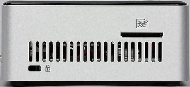 Еще одно новшество — расположенный на боковой грани разъем для карт памяти типа SDXC. Вообще говоря, для мини-ПК привычный элемент, но в NUC он ранее не встречался, несмотря на то, что SoC линеек Bay Trail и Braswell имеют встроенную поддержку интерфейсов SD и MMC. И неплохую — в отличие от многих USB-картоводов, поддерживается стандарт UHS-I, позволяющий выйти за ограничение ≈20 МБ/с, свойственное «оригинальным» SD-картам. Правда, практика показала, что не слишком-то далеко: для примера microSD-карта SanDisk Ultra емкостью 200 ГБ продемонстрировала в слоте NUC скорости чтения и записи 73,8/30,7 МБ/с соответственно, в то время как в лучших моделях мультиформатных картоводов с интерфейсом USB 3.0 мы от нее получили и 89,3/59,6 МБ/с (во всех случаях приведены скорости в бенчмарке CrystalDiskMark 5.0.2), благо официально она как раз поддерживает до 90 МБ/с, однако... Однако встроенное решение оставляет свободным USB-порт и позволяет вообще не покупать картовод, ради чего чуть более низкие скорости, чем потенциально возможно, многие пользователи готовы и потерпеть. Не говоря уже о том, что «терпеть» придется только лишь владельцам наиболее быстрых карт, а если стоит задача просто посмотреть, к примеру, свежеотснятые фотографии, разницы в скорости вообще не будет :) Правда вот стоит учесть, что под управлением Windows 7 он не работает — нужна Windows 8 или новее.