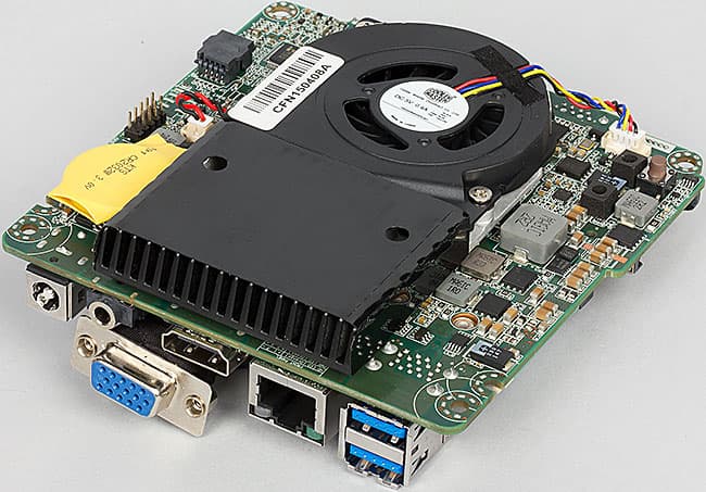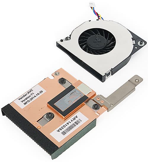 На обратной стороне платы традиционно расположено то, доступ к чему покупателю не понадобится, а именно сама SoC, закрытая системой охлаждения. Вариантов первой два — либо старший в семействе двухъядерный Celeron N3050 (такая модель у нас и была), либо тоже старший, но четырехъядерный Pentium N3700. TDP обеих микросхем составляет всего 6 Вт, так что активная СО кажется несколько избыточной. Тем более, что она очень похожа на то, что мы видели в NUC на Core. Но лишь похожа.