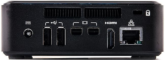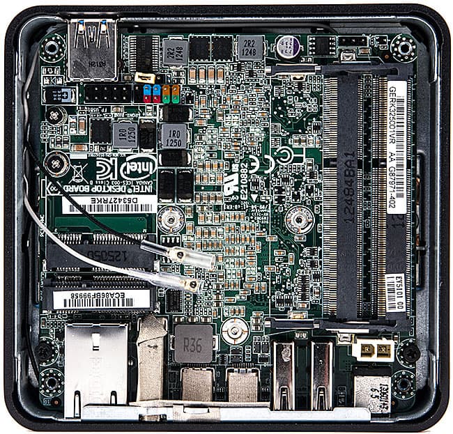 Три прочих разъема на корпусе NUC не изменились. От входа блока питания, впрочем, иного никто и не ожидал, а вот USB желательно было бы модифицировать до поддержки третьей версии стандарта. Или хотя бы попробовать увеличить количество таких портов, поскольку трех портов (суммарно) некоторым пользователям маловато. Есть еще, правда, пара портов USB 2.0 на самой плате (в предыдущих моделях соответствующая гребенка была разведена, но не распаяна), однако воспользоваться ими в штатном корпусе не представляется возможным (разве что подключить такую экзотику, как USB DOM). В новых моделях NUC положение дел немного изменилось: в частности, портов USB стало четыре, а не три, но ценой уменьшения количества дисплеев. Удастся ли объединить все достоинства семейств? Покажет время.