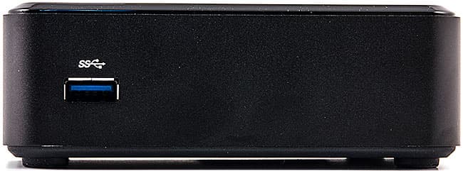 Сам же компьютер на первый взгляд не слишком изменился — как уже было сказано выше, это все еще первое поколение NUC, использующее все те же корпуса размерами 117×112×40 мм, а не более компактное и вообще переработанное второе. Так что и на лицевой поверхности все тот же единственный порт USB. Точнее, не совсем тот же: если три модели «первой волны» располагали лишь USB 2.0, то в DC53427HY на «морде» находится порт USB 3.0.
