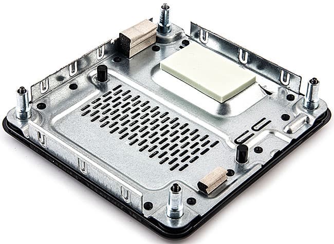 Процедура разборки NUC не изменилась и до сих пор представляет собой очень простой комплекс действий: достаточно открутить четыре болтика, чтобы снять нижнюю крышку и получить доступ ко всему, что может пригодиться пользователю. Немного изменилась, правда, сама крышка — ее внутренняя металлическая часть имеет выгиб, к которому прикреплена эластичная теплопроводящая прокладка. Зачем? А чтобы отводить тепло от SSD-накопителя — как мы уже писали, установка слотов Mini-PCIe и mSATA «бутербродом» ранее иногда приводила к тому, что накопитель и адаптер Wi-Fi перегревали друг друга. Основная часть вины за это лежала именно на SSD — при активном использовании они заметно нагреваются. Ранее все тепло уходило в воздух в замкнутом пространстве, что и могло привести к появлению проблем, а теперь вот придумали, как отводить тепло. Изменение в любом случае не бесполезное — хоть с такими проблемами никто, кроме тестеров, не сталкивался, лучше до них не доводить.