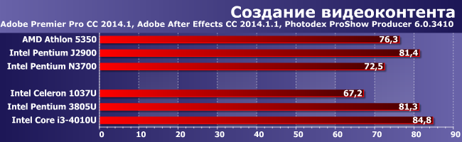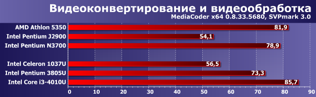 Поскольку работа с видео вовсе не ограничивается одним лишь кодированием, в этой группе программ «способность к многопоточности» (любой) дает меньше, чем в предыдущей. И вот тут уже Pentium 3805U легко и непринужденно вошел в тройку лидеров, причем весьма плотную.