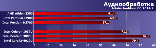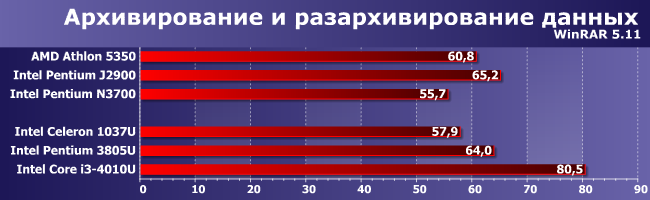 В тестах архиваторов — не хватило. Впрочем, только в случае Pentium J2900, а вот необходимость «впихнуть» в обновленные процессоры больше графических блоков привела к тому, что N3700 и от 1037U снова начал отставать.