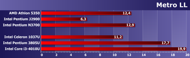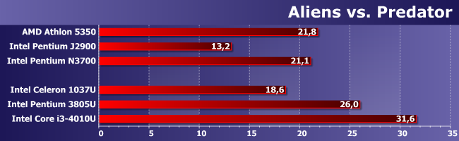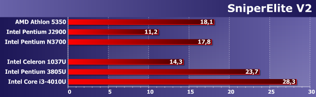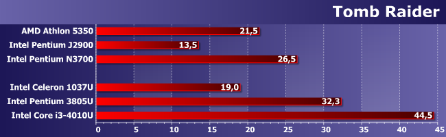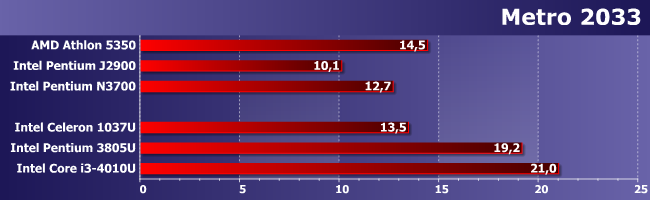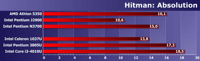 В Hitman однозначно плох лишь Pentium J2900, а остальные уже сравнимы друг с другом. Для того, чтобы играть, этого все равно не хватит, но можно хотя бы повозиться с настройками и попробовать добиться более приемлемого результата.