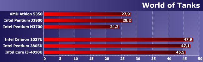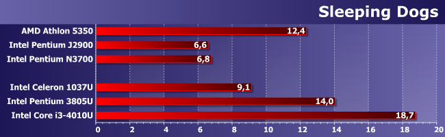 Celeron 1037U обгоняет только Pentium J2900, но обгоняет заметно. Впрочем, это и ожидалось — архитектура GPU у этих процессоров одинаковая, а по количеству и частотам исполнительных блоков 1037U впереди. У 3805U вдвое больше блоков, причем более новых архитектурно, так что он уже намного быстрее любых суррогатов. Чего, впрочем, еще недостаточно для получения «играбельной» частоты кадров, но уже довольно близко к порогу.
