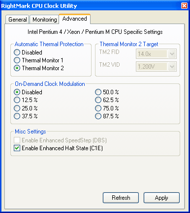 Как бы там ни поступал производитель процессоров, чипсетов и материнских плат со своей продукцией, нам ничего не мешает включить интересующие нас настройки вручную, с помощью закладки специфических настроек процессора (Advanced) утилиты RMClock. Включаем TM2 (его, в принципе, можно и не включать), C1E и смотрим на результат.