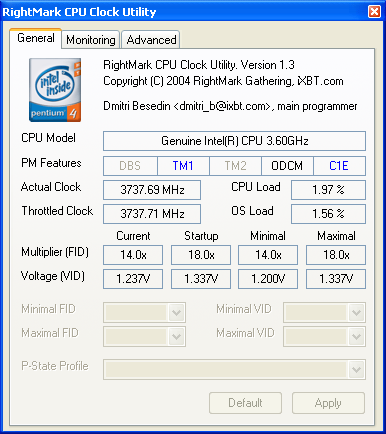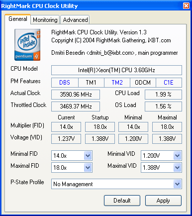 Что ж, теперь самое время увидеть новую технологию в действии. Для этого используем нашу утилиту RMClock, которая с момента выхода предыдущей публикации уже успела «обрасти» дополнительными возможностями — в частности, специфических настроек функций управления энергопотреблением процессоров Intel Pentium 4, Xeon и Pentium M, позволяющими нам отныне обойтись без вспомогательных утилит вроде CPUMSR.