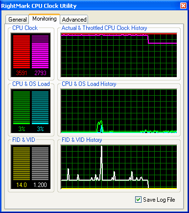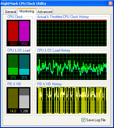 Переходим к главным закладкам приложения — так они выглядят после нескольких минут работы приложения в отсутствие загрузки процессора. По левой картинке видно, что процессор поддерживает технологии TM1, TM2, ODCM и C1E, из которых в данный момент (т.е. по умолчанию) задействованы только TM2 и C1E. Действие последней заметно уже здесь — для этого достаточно сравнить текущие значения FID и VID процессора с номинальными. Первое находится на минимальном уровне, второе — где-то посередине между минимумом и максимумом. Динамика изменений FID/VID отчетливо видна на правой картинке — при минимальной нагрузке на процессор FID остается на постоянно низком уровне (14x), VID колеблется в довольно широких пределах, а его средняя величина составляет примерно 60% от номинальной. Отметим, что изменения VID, вообще говоря, могут и не отражать реальные изменения питающего напряжения процессора, поскольку VID — это всего лишь значение напряжения, которое процессор запрашивает для собственного питания, а материнская плата в принципе вольна сделать с этим запросом все, что угодно (прежде всего, вообще ничего не менять). Тем не менее, в наших тестах изменение реального напряжения процессора также фиксировалось (с помощью утилиты Hardware Monitor из набора Intel Desktop Utilities, которая опирается на показания сенсоров материнской платы), причем последнее было занижено примерно на 0.1V относительно значений VID.