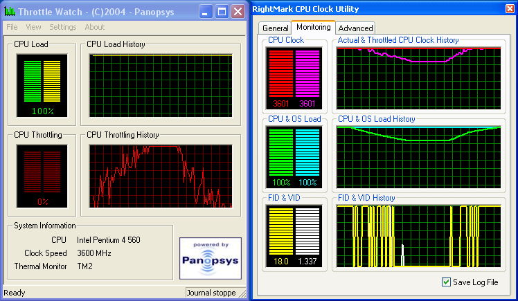 Итак, новая ревизия ядра Nocona поддерживает все пять «термальных» технологий — от «древних» ODCM и TM1 до новых и новейших TM2, DBS и C1E. Из них на момент запуска приложения включены DBS (кстати, заметим, что поддержку технологии серверного Enhanced SpeedStep можно включить/выключить в настройках BIOS; кроме того, она автоматически включается утилитой RMClock при ее запуске) и, как это ни странно, старый вариант термического троттлинга — механизм автоматического термального мониторинга №1 (TM1), в противоположность 3.6-ГГц процессору Pentium 4. Что интересно, настройки целевых значений FID/VID для TM2 выставлены BIOS-ом корректно (это можно увидеть по Minimal FID/VID), однако сама технология почему-то не включена по умолчанию. Наконец, заметим, что C1E по умолчанию также отключена (напомним, ее включение/выключение — также задача BIOS), что отчетливо видно по правому скриншоту: значения FID/VID не меняются с течением времени. Можно предположить, что «невключение» C1E на серверной платформе продиктовано соображениями максимальной производительности (минимального времени отклика сервера на запрос): из общих соображений очевидно, что как вход в состояние C1E, так и выход из него сопровождаются большими задержками по сравнению со входом в/выходом из обычного состояния C1 (HALT), в связи с необходимостью переключения режимов работы процессора (FID/VID) в сторону меньшего энергопотребления и обратно.