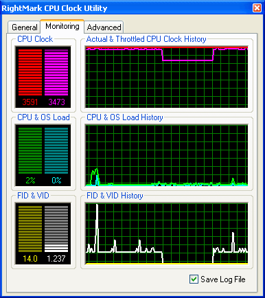 Результат выглядит вполне ожидаемо (а картина аналогична той, которую мы получили на процессоре Xeon) — по достижении процессором температуры 73°C наблюдается снижение «эффективной» частоты процессора наряду с плавным снижением его загрузки. По графику FID/VID видно колебание FID между двумя уровнями — минимальным и максимальным. В то же время заметно, что переключение VID может осуществляться через промежуточные состояния (как и в технологии C1E, только изменения происходят гораздо резче).