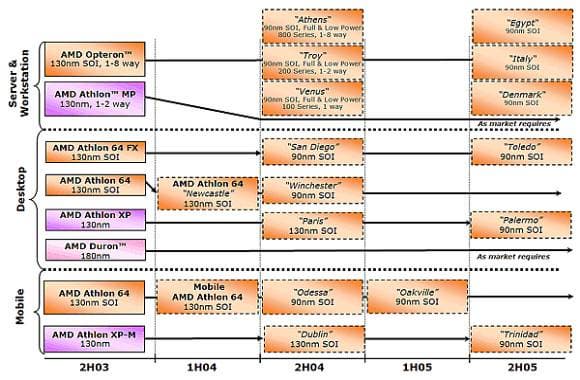 В любом случае, новая платформа AMD понемногу входит в обиход, 32-битные чипы Athlon XP, хоть и будут поддерживаться компанией как минимум до 2005 года и даже будут портированы на 90 нм/SOI техпроцесс, все же ушли в бюджетный сектор. В нынешнем году все силы разработчиков AMD будут направлены на запуск во втором полугодии 90 нм техпроцесса, поэтому на первое полугодие 2004 компания запланировала выпуск только двух новых процессорных ядер. Одно из них — Mobile Athlon 64 на 0,13 мкм техпроцессе с SOI, выпуск которого был перенесен AMD с четвертого квартала 2003. Вторым станет ядро Newcastle — обновленный Athlon 64 для настольных ПК с 130 нм нормами и SOI. Главным его отличием от нынешнего Athlon 64 станет более качественная оптимизация ядра под функции настольного ПК, а также размеры кристалла — порядка 150 кв. мм.