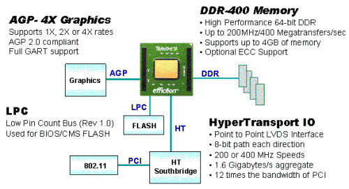 Самым неожиданным событием стало то, что компания решила использовать в TM8000 400 МГц шину HyperTransport. По аналогии с нынешним поколением процессоров Crusoe, TM8000 обладает встроенным в интегрированный северный мост контроллером памяти, однако, в отличие от поддержки DDR266 нынешними Crusoe, Efficeon поддерживает стандарт DDR400 и ECC (дополнительный плюс для серверного сегмента). Помимо прочего, новый процессор обладает интегрированной шиной AGP 4X и шиной Low Pin Count (LPC) для работы с флэш-памятью.