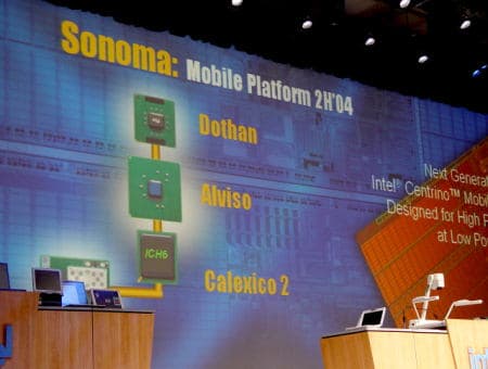 Во второй половине 2004 года будет представлена новая мобильная платформа Sonoma на базе технологии Intel Centrino для мобильных ПК. В состав платформы Sonoma войдут: будущая модель процессора Pentium M, интегрированное решение для беспроводного доступа к сетям стандарта 802.11a/b/g, а также новый чипсет с рабочим названием Alviso. Этот чипсет будет отличаться новой интегрированной графикой и поддержкой шины PCI Express, наличием интерфейса NEWCARD, поддержкой памяти DDR2, интерфейса Serial ATA и аудио интерфейса Intel High Definition Audio (бывший Azalia).