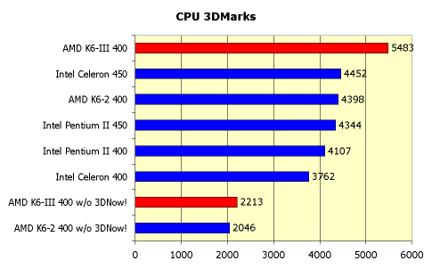 Но все же главное применение процессоров сегодня — это игры, которые требуют мобилизации всех вычислительных мощностей. Для оценки производительности, которую могут показывать процессоры при обработке 3D-сцен, мы воспользовались тестом CPU 3DMark, входящем в тестовый пакет 3DMark 99 MAX. Этот тест просчитывает 3D-геометрию, но не выводит результат на экран. Таким образом, можно померить пиковую производительность процессора в игровом 3D, не зависящую от установленной видеокарты. Быстродействие K6-2 и K6 III мы исследовали в двух вариантах — с включенным и выключенным блоком 3DNow!.