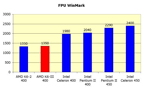 Да, действительно, на K6-III можно гордо навесить ярлык "лучший процессор для целых чисел". Здесь же можно пронаблюдать, как выросла производительность по сравнению с AMD K6-2 за счет введения быстрого L2-кэша. Но, к сожалению, немалое значение, особенно в играх, имеет и скорость работы FPU. А это - давнее бельмо на глазу AMD.
